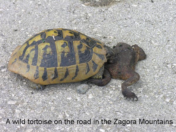 Next morning the rain had stopped and we set off on George’s route. Zagori is a massive international wild reserve with some 46 scattered mountain villages, many protected as places of cultural importance. It has unique and rare flaura and fauna which includes brown bears, eagles, wild goats, deer and jackals. We saw no bears but did see a wild tortoise in the road devouring an enormous dead frog.