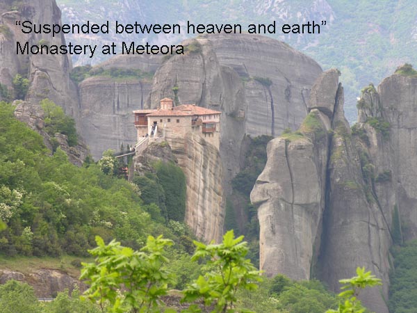 Meteora is a geologically unique area on the eastern edge of the Pindos mountain range. The area is made up of massive vertical pillars of black volcanic rock that rank as one of the natural wonders of the world along with Grand Canyon and Hanging Rock. Saint Athananasos founded the first monastery in 1336 on top of one of the largest pillars. By the 16th century there were 24 other monasteries “suspended between heaven and earth” and every cave and rock hole was occupied by hermits. Nowadays only a couple of monasteries are devoted to religion. The rest are tourist attractions. We stayed in the little village which sadly is given over to tourism of the worst type with fake icons, camping sites and coach tours all around. Our hotel was half camp site with a small hotel at the foot of one of the massive pillars.
